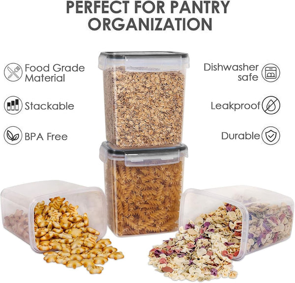 The set includes large, medium, and small rectangular containers to suit pasta, cereal, flour, sugar, snacks, and more. Mix sizes to match pantry needs and reduce wasted space.